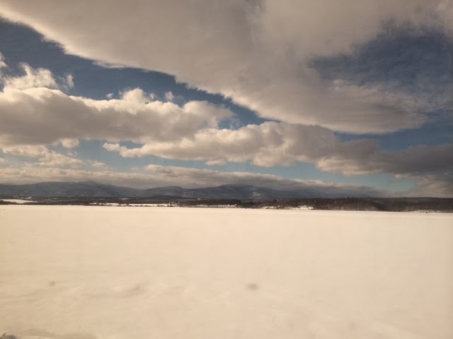The train trip was quiet, hot and bumpy. Flowing silently beside us, the Mohawk was frozen over and only a narrow channel was carved by a Coast Guard cutter through the Hudson. Huge heating oil barges crawled upstream pushed by tugboats.